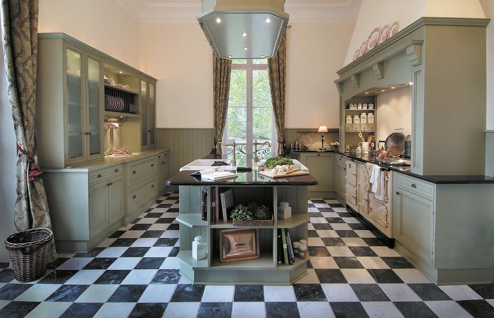 Hochwertige Natursteinplatten mit eleganter Rundkante, antik patinierte Griffe und Glasvitrinen mit Strukturglas. Dazu massive Kücheninseln, freistehende Range Cooker und repräsentative Hochschränke mit aufwendigen Profilen und Kranzleisten. Alle Details sind sorgfältig komponiert – nichts wirkt zufällig. Ein Raum für Menschen mit Sinn für Inszenierung und gehobene Wohnkultur.