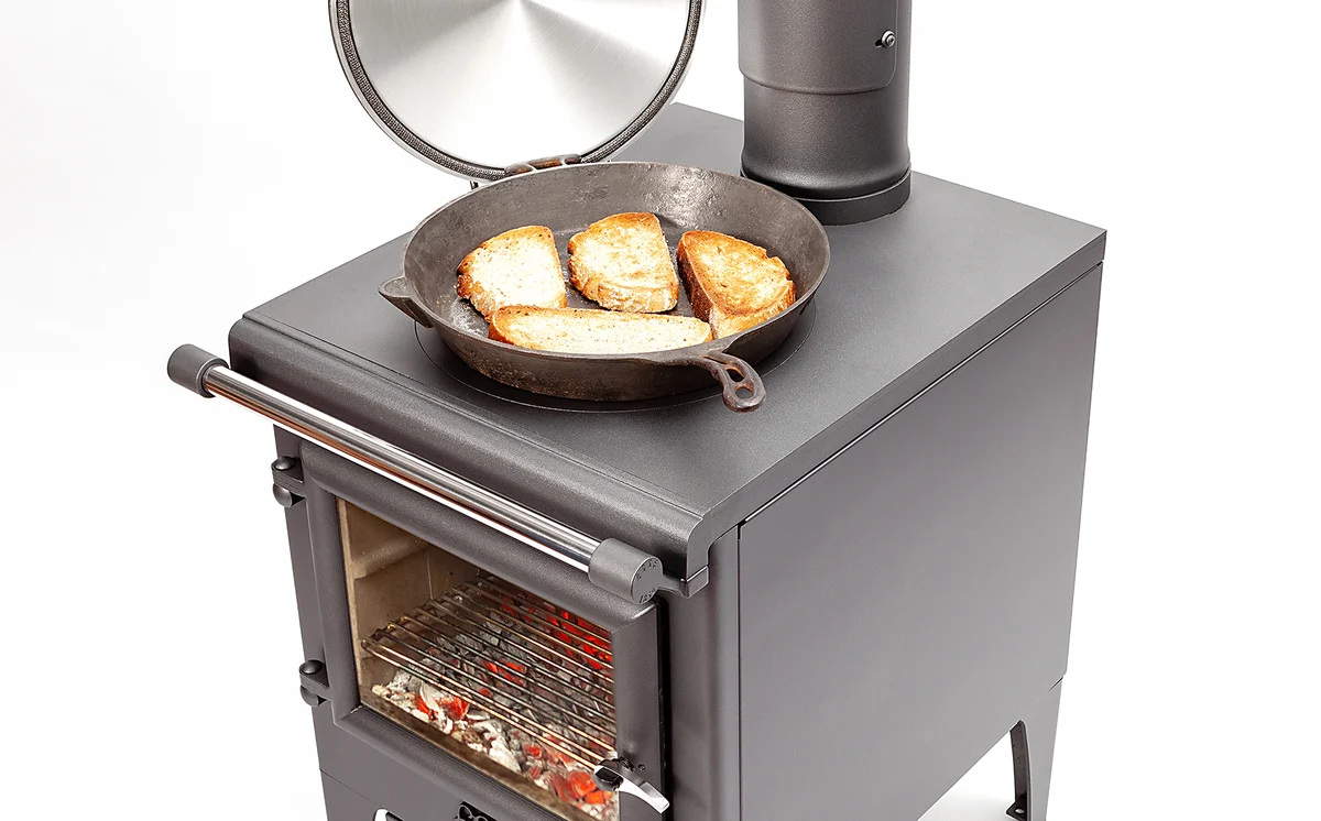 Die Kochstelle eignet sich perfekt zum Kochen, Braten oder Warmhalten – ganz ohne Strom. Sie bietet Platz für mehrere Töpfe und Pfannen und reagiert feinfühlig auf die Feuerintensität. In der Brennkammer kann auch gegrillt – ideal für Brot, Aufläufe oder Schmorgerichte direkt über dem Holzfeuer.